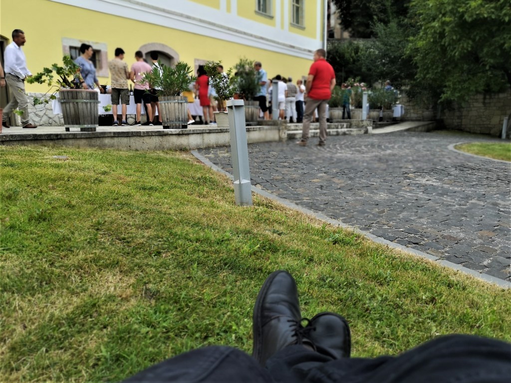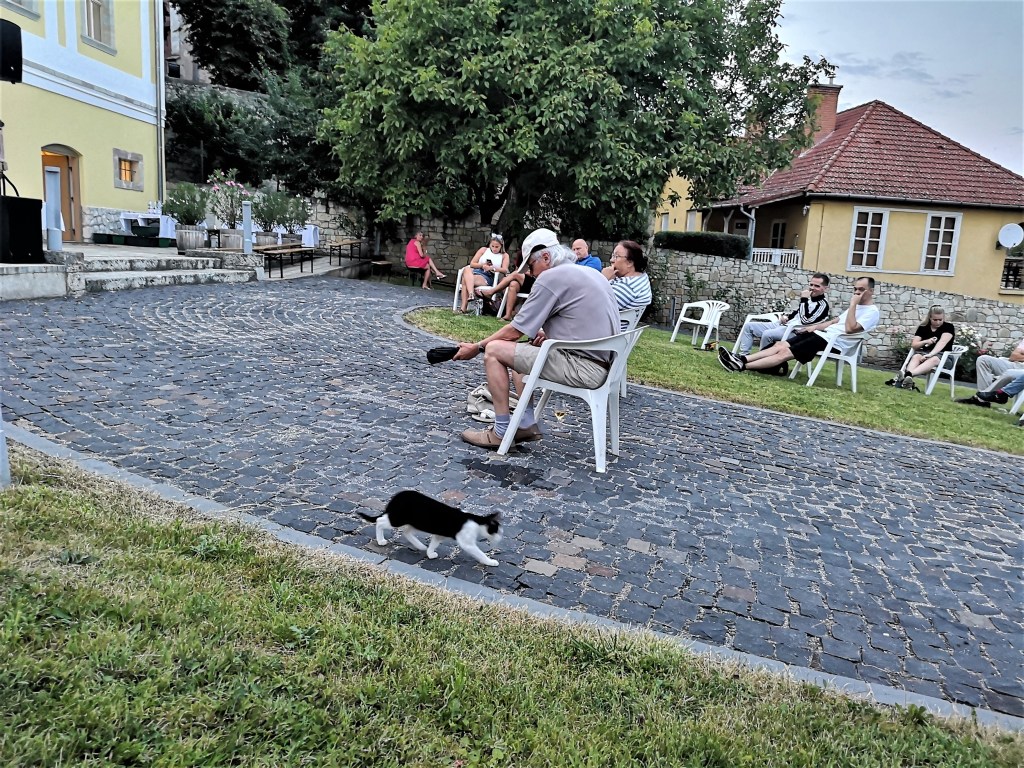 Kellemes kényszeremből indíttatva eszerint jártam el, egy órán belül bebiztosítottam a Pincészet fennmaradását oly módon, hogy hibapont nélkül sikerült végigkóstolni a kiállított tételeket és így aztán már elégedetten, nyugodtan, székemben hátradőlve figyelhettem a minderről mit sem sejtőket, hallgathattam a jazz-t, és szemlélődhettem kedvemre záróráig. Aztán közben jöttek a szúnyogok és rájöttem, hogy mégiscsak ez a valóság, merthogy a mesében nem voltak szúnyogok. Mese ide vagy oda, intenzíven vakarózni kellett, de a már a további időkre el nem süllyedt pincészet halhatatlan személyzetének és a vendégseregnek úgyszintén ezt kellett tennie és ez így már olyan prózai, hogy nem is folytatnám a történetet, inkább csak nézegessünk fotókat a rendezvényről!