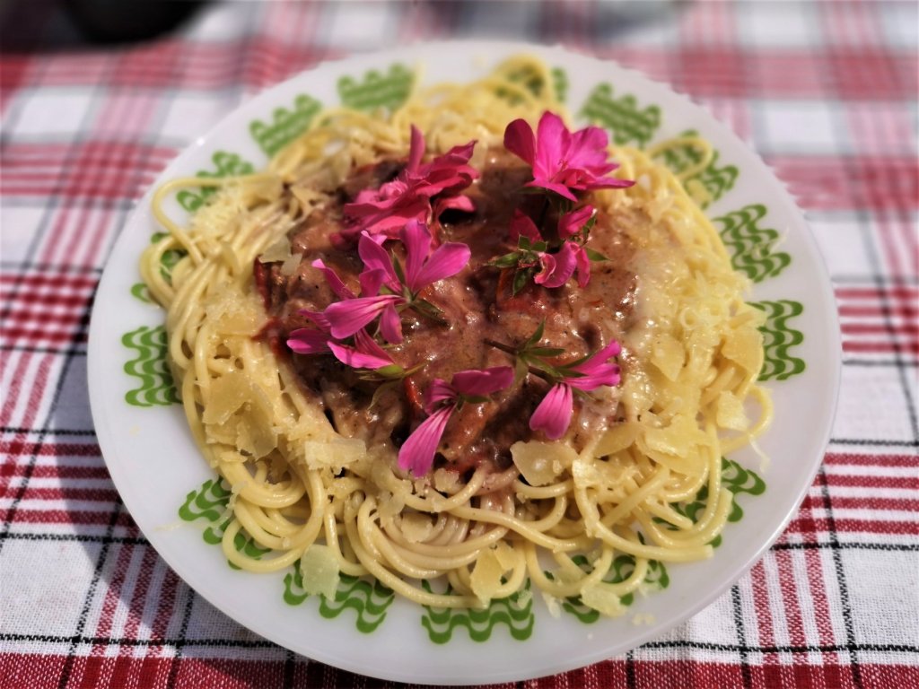 Már csak némi darabos Parmezán sajt kellett, aztán díszítésnek a színben hozzá passzoló kétféle muskátli meg az egyféle rózsaszínű leander virága a felszínre és lőn meg is valósult a szépséges és ízletes Spaghetti Zugloese ala Robinson nevű nagyszerű egytálétel, kimondottan a péntekekre hangolva.