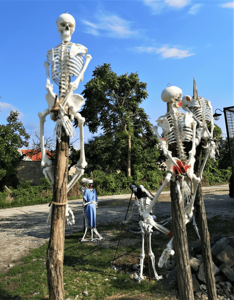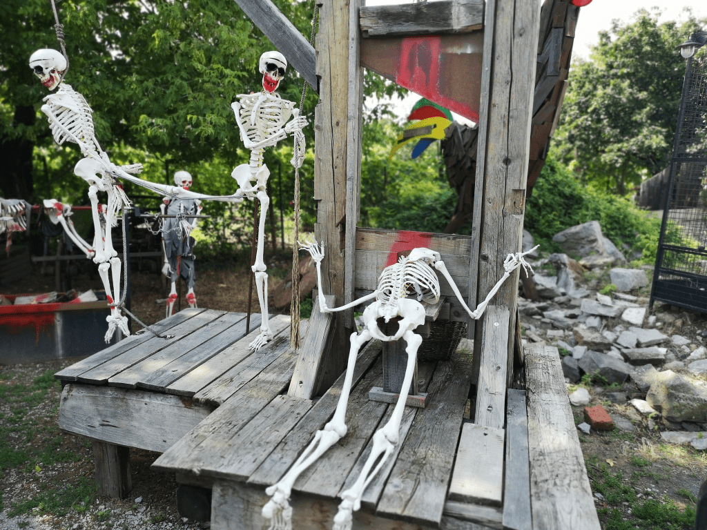 Csak egy vakmerő módon, saját maguktól leülő másik „JancsiJuliska” jellegű párocskának intézett beszéd szófoszlányaiból következtettem arra, hogy bizony előfordulhat az is, hogy itt mi ekkor nem eszünk ebédet, amit egy zord tekintetű, középkorinak öltözött ember szinte szóról szóra nekünk is elmondott, úgymond copy – paste és már utunkra is bocsátott minket. Kiérve a parkolóhoz láttuk, hogy voltak akik vagy nem fogadták el a szomorú tényt, hogy máshol kell ebédelniük, vagy esetleg a Középkori Paraszt Étterem hármas szóösszetételből csak az első kettő szót mondták sértődötten a zordtekintetű szemébe, ki tudja, de odakünn a látvány a lenyakazással, karóbahúzással és más hasonló műveletekkel a tiszteletlenekkel szemben, az magáért beszélt és még sokáig fog is.