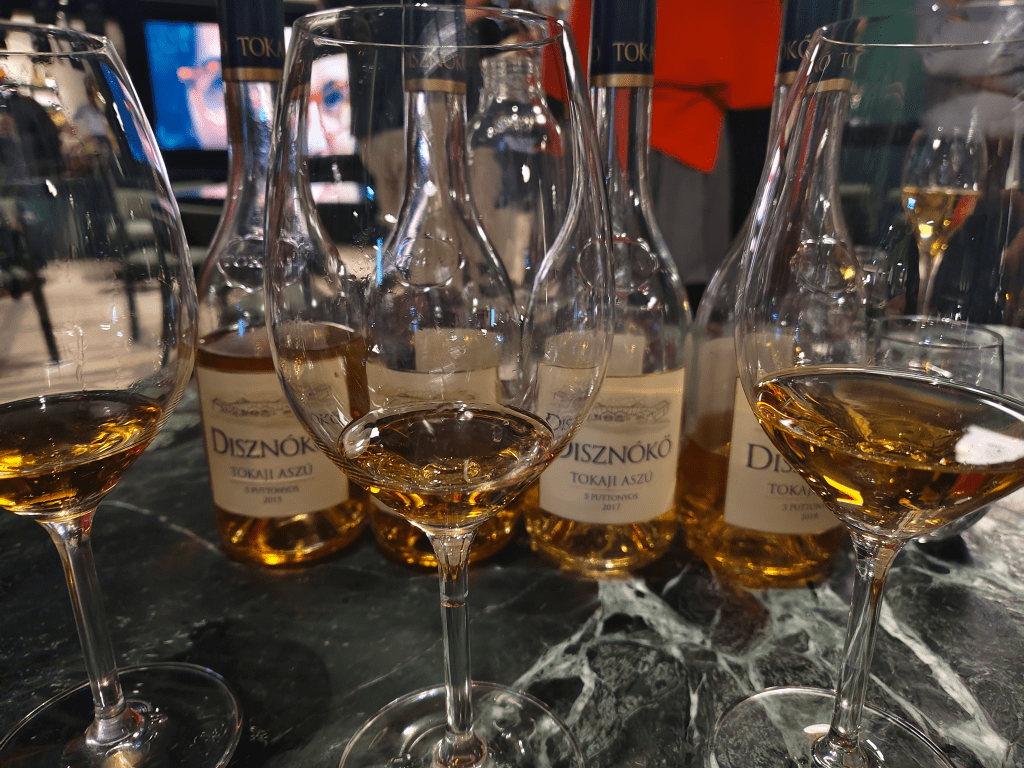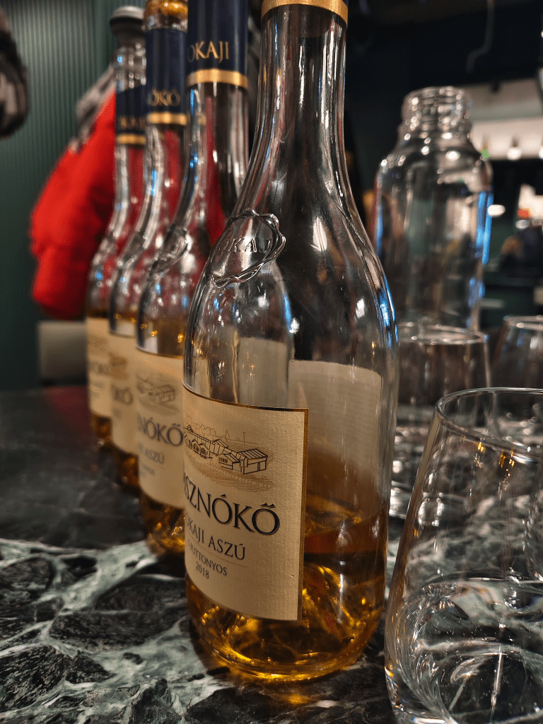 Ez egy eldöntendő kérdés volt és valószínűleg arra utalt, hogy az állapotom körülbelüli felmérése után a Gergő valami innivalót még kínálna nekem. Természetesen ilyenkor illik igent mondani, aminek következménye az lett, hogy pár percen belül az asztalunkon találtam egy komplett öt puttonyos Aszú sort, vertikálisan is és sréhen is a poharam irányába helyezve. A címkékre az volt írva, hogy Disznókő, meg az 5, meg az, hogy Aszú.